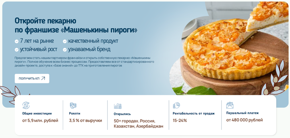 В целом, грамотная поддержка франчайзера и готовая концепция делают «Машенькины пироги» франшизой с минимальными вложениями и комфортным входом в бизнес. Хотите узнать больше или проконсультироваться? Запросите коммерческое предложение – заполните форму на сайте.