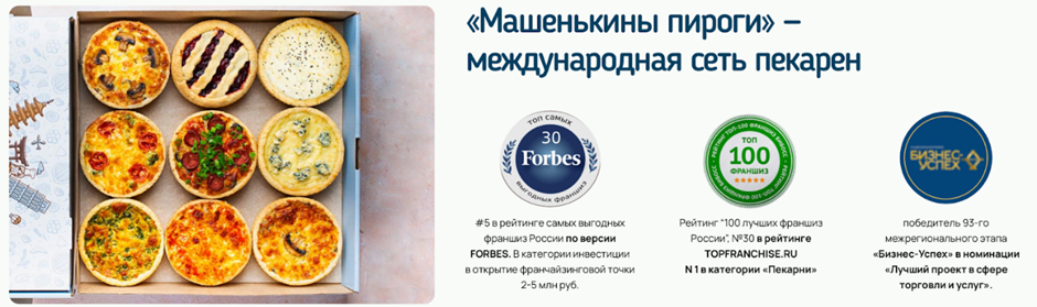 Франшиза пекарен «Машенькины пироги» – яркий пример надёжного проекта. Это действительно «первая и единственная в настоящее время франшиза пирогов на песочном тесте», уже представлена в более чем 50 городах России, а также в Казахстане и Азербайджане.
